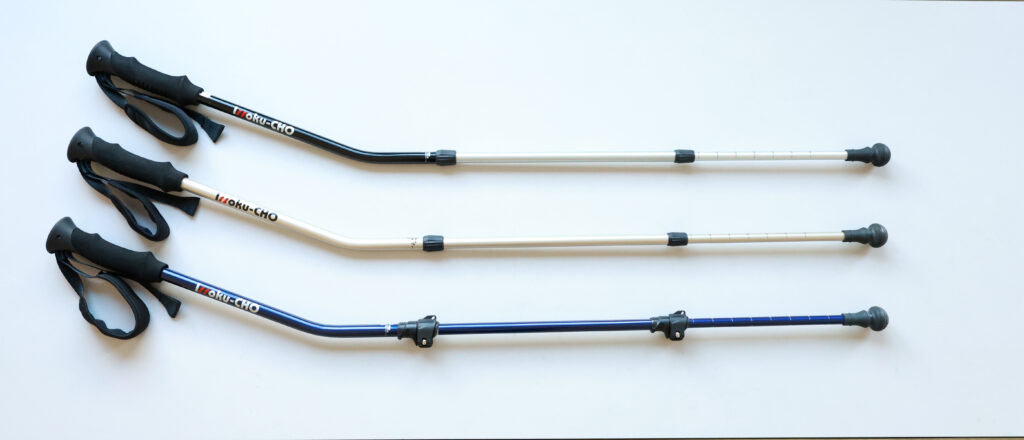 市販のトレッキングポールを購入して曲げ具合を丹念に検証した結果、杖が前方に曲がっていることで3つの機能的な優位性があると分かった。第一に、安定した歩き出しが可能になる。第二に、腕や肩を大きく動かさずに済むため疲れにくい。第三に、杖のしなりが前方への推進力を生む。持ち手から先端までの水平距離が25cm、およそ一足分前に接地している状態が最も歩きやすいと突き止め、この歩行補助杖をIssoku-CHOと名付けた。