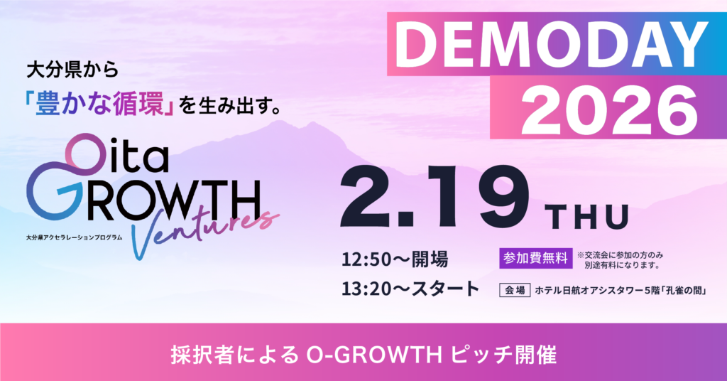 大分県アクセラレーションプログラム「Oita GROWTH Ventures」では、集大成として2月19日(木)にOita GROWTH Ventures DEMODAY 2026を開催します。